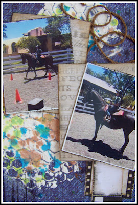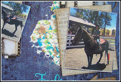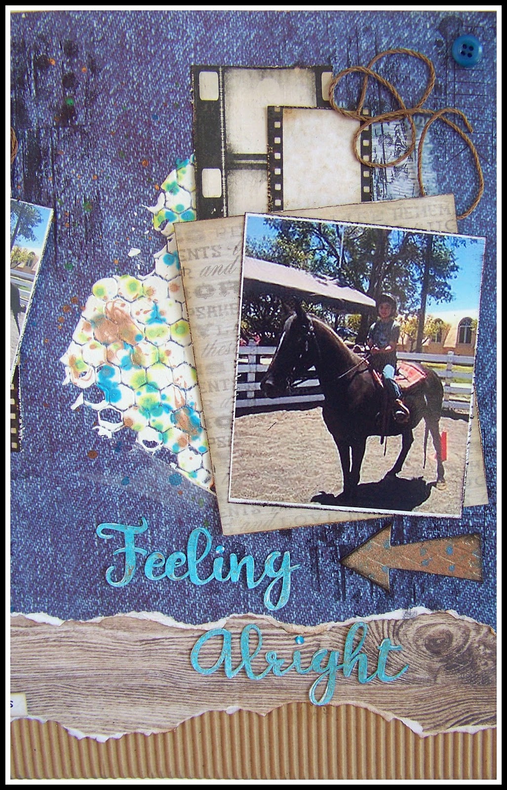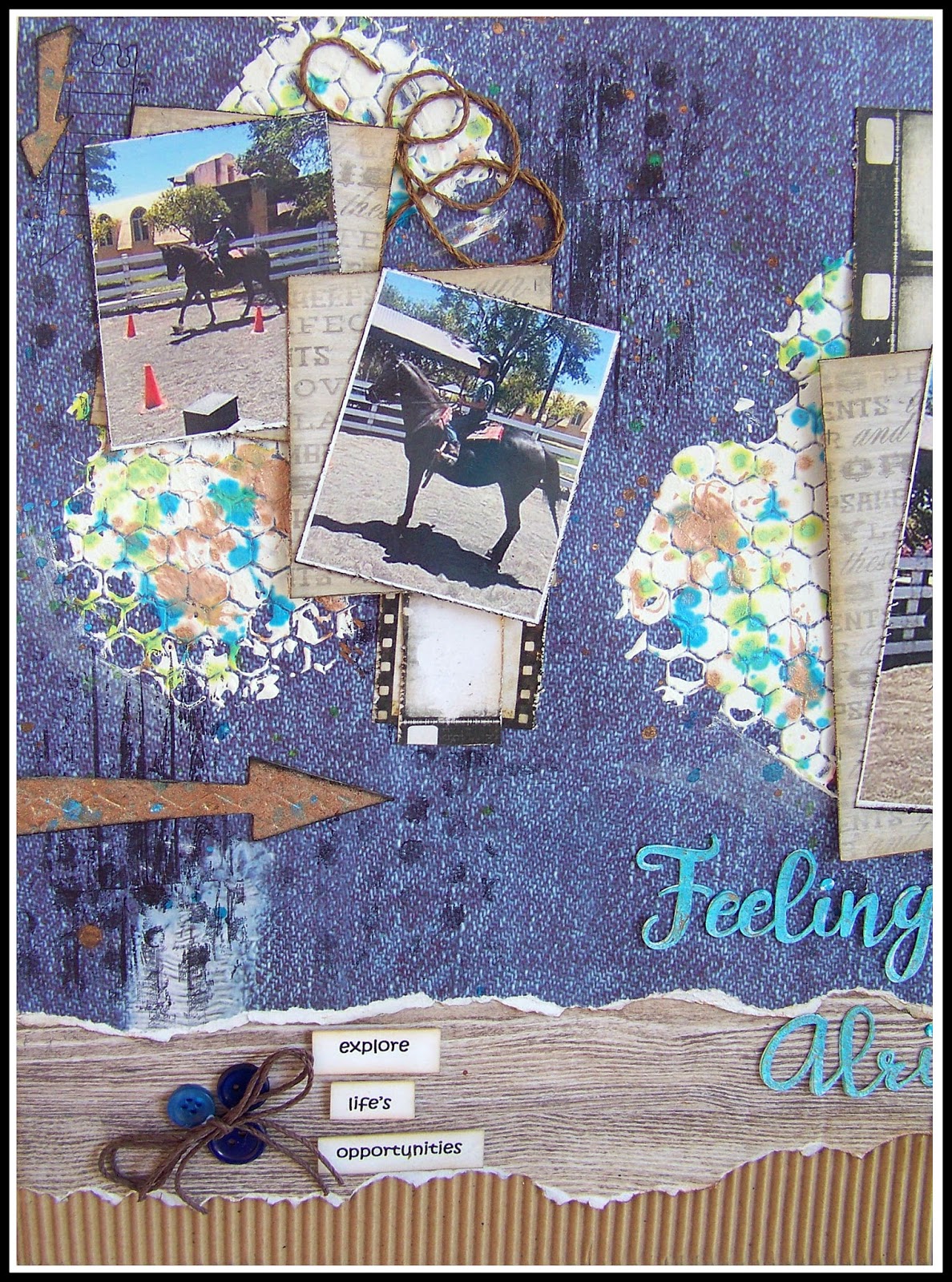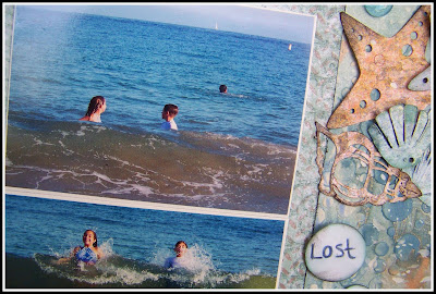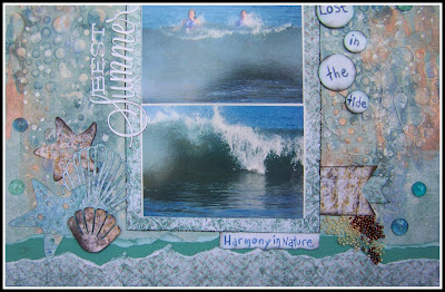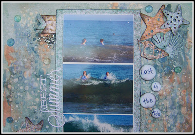 This layout is loaded with fun mixed media. Stencil and texture paste, lots of misting and splatting. I just feel the water when I look at it. My song was Listen To Your Heart from Roxette and I pulled the line Lost in the tide. I punched circles and wrote the words then inked and popped it all on foam squares.