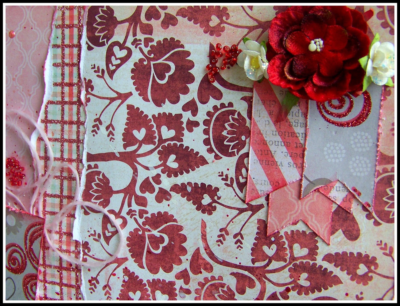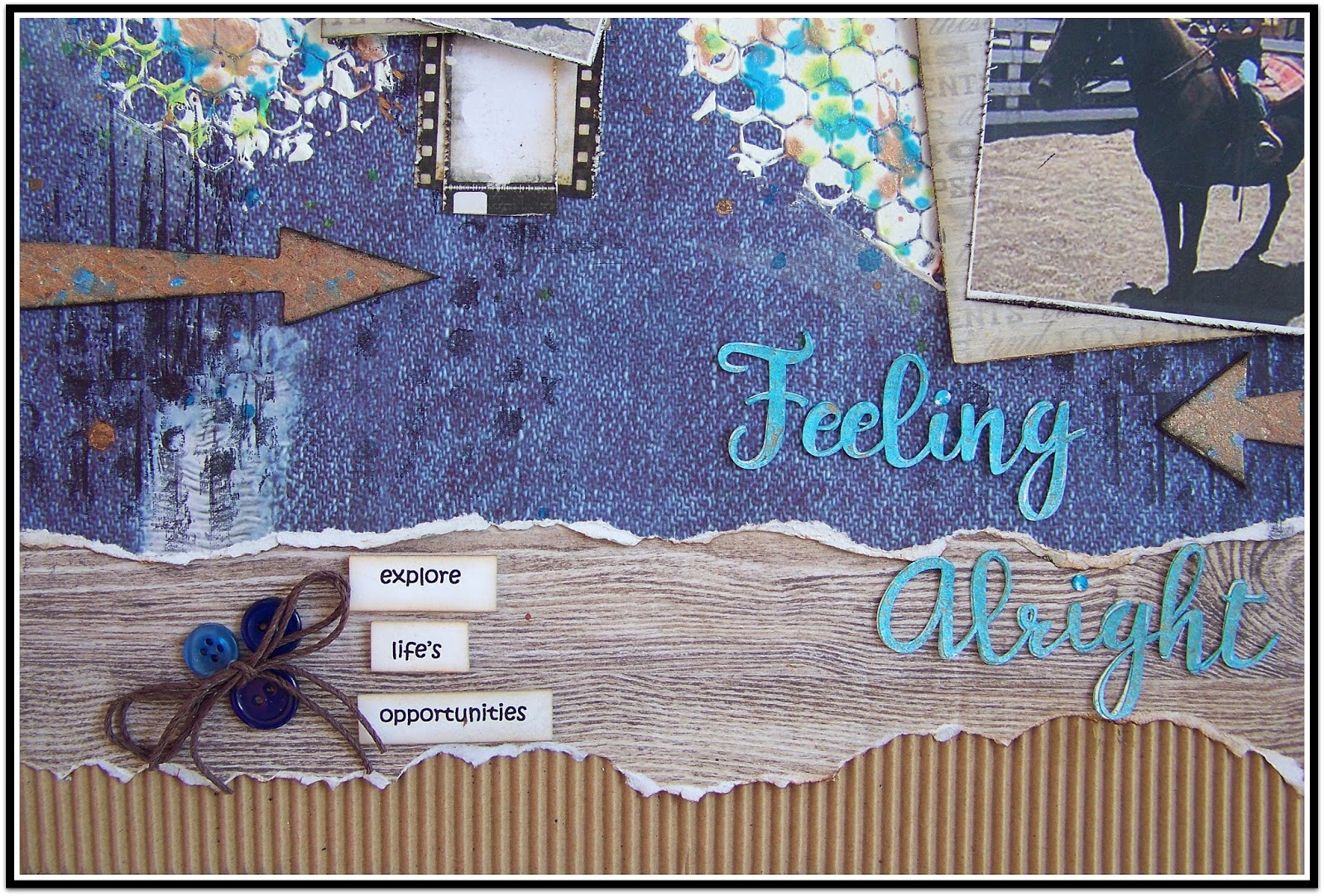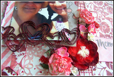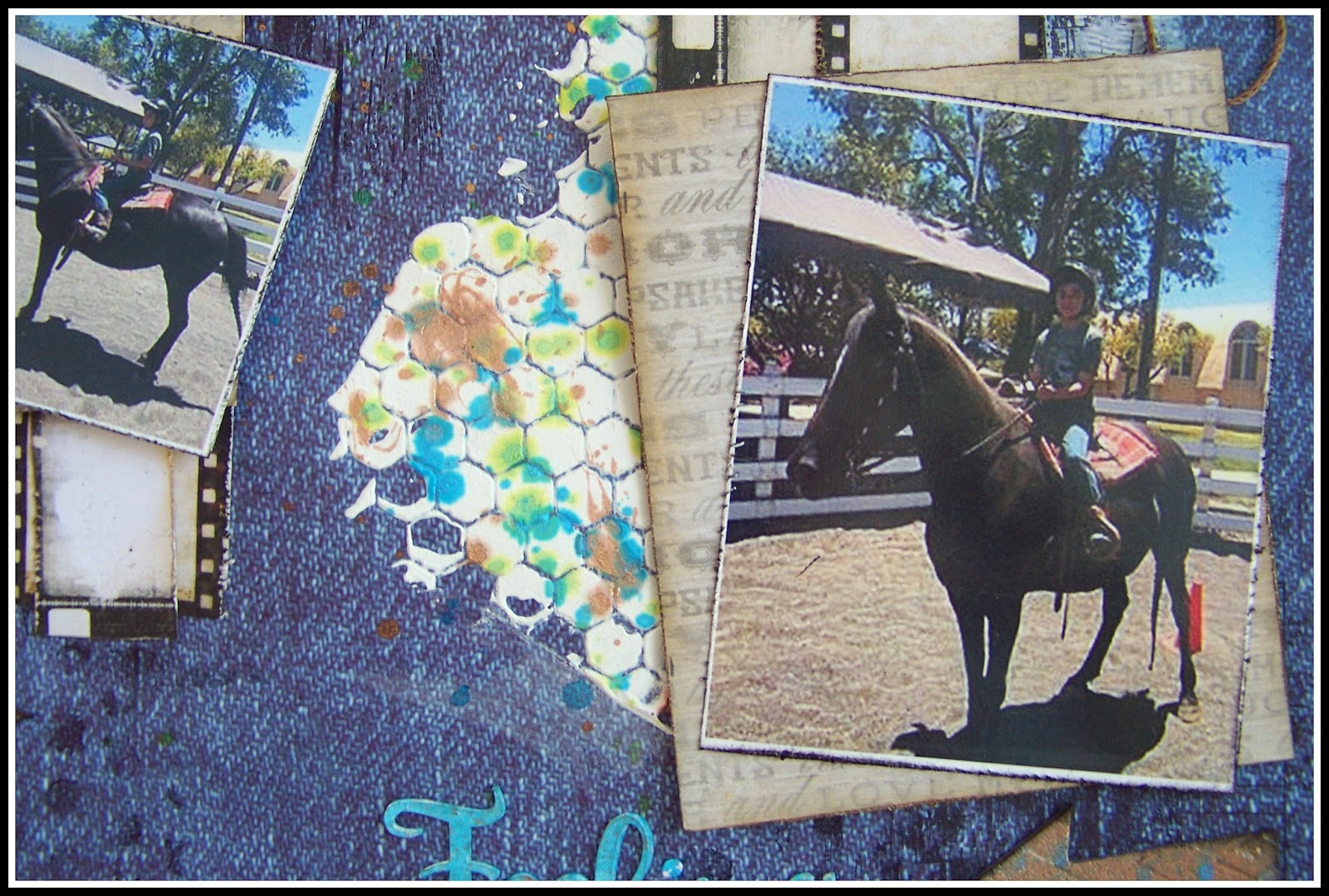 This layout is loaded with fun mixed media. Stencil and texture paste, lots of misting and splatting. I just feel the water when I look at it. My song was Listen To Your Heart from Roxette and I pulled the line Lost in the tide. I punched circles and wrote the words then inked and popped it all on foam squares.
